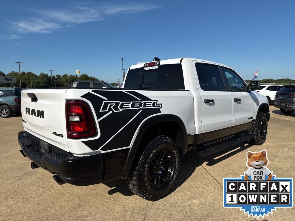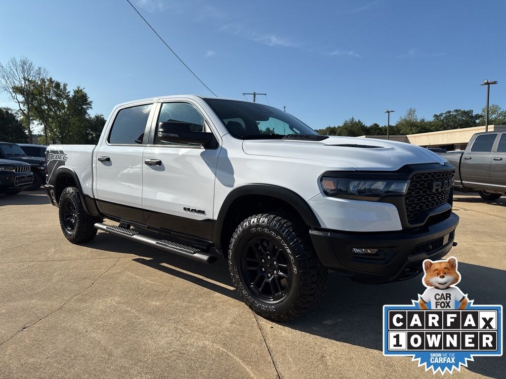 Clean CARFAX. CARFAX One-Owner. Bright White Clearcoat 2025 Ram 1500 Rebel 4WD 8-Speed Automatic 3.0L I6 MultiPoint Inspection, Auto Power-Folding Mirrors, Auto-Dimming Exterior Driver Mirror, Black Premium Power Mirrors, Convex Wide-Angle Exterior Mirror Insert, Exterior Mirrors Courtesy Lamps, Exterior Mirrors w/Heating Element, Exterior Mirrors w/Supplemental Signals, GPS Navigation, Navigation System, Power Adjustable Pedals, Quick Order Package 21W Rebel, Radio: Uconnect 5 Nav w/12.0" Display, Rear Window Defroster, Rebel Level 1 Equipment Group, Remote Tailgate Release, SiriusXM w/360L, Steering wheel mounted audio controls, Wireless Charging Pad.